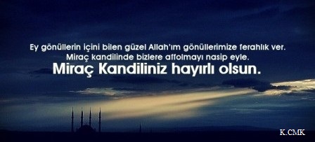 Toplumumuzda mukaddes gün ve gecelerin çok büyük önemi vardır.Miraç gecesi de onlardan biridir.Üç aylarda Regaip Kandiliyle başlayan mübarek geceler birçok hikmet,sır ve bereketi içinde barındıran Miraç Kandili ile devam eder.Yardıma muhtaçlara el uzatma, destek olma ve paylaşım bu mübarek aylarda ve gecelerde daha da ayrı bir önem kazanır.Bu aylarda akrabalık ve komşuluk ilişkilerimizi yeniden gözden geçirmeli,toplum huzurunun ve kaynaşmasının sağlanmasına yönelik adımlar atmalıyız.Gelenek ve göreneklerine bağlı böylesine günleri çok önemsemekte, dostluk,kardeşlik,birlik ve beraberlik adına en güzel paylaşımları yaşamaktadır.Mübarek Miraç Kandili`nin tüm İslam alemine ve halkımıza hayırlara vesile olmasın diliyorum.